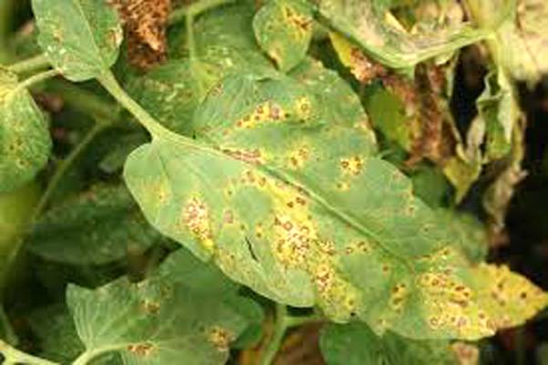 • Foliar application of Copper hydroxide(0.2%) or Chlorothalonil (0.2%) or Mancozeb (0.2%) or Propineb (0.2%) or Metiram(0.2%) or Pyraclostrobin + Metiram(0.2%) for the control of earlyblight from the onset of disease and repeat at 10 to 15 days interval.
